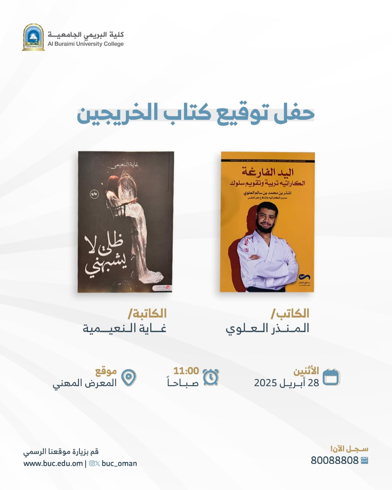 Alumni Book Signing CeremonyAuthor: Al-Munther Al-Alawi || Author: Ghada Al-Nuaimiya+ Add to Google Calendar DateApr 28 2025Expired! Time 11:30 am - 12:30 pm Location Al Buraimi University CollegeAl Buraimi Opening Hour 08:00 am - 04:00 pm Website https://buc.edu.om Phone +968 25657666 Category Events Organizer Al Buraimi University College Phone +968 56267666 Email info@buc.edu.omShare this event